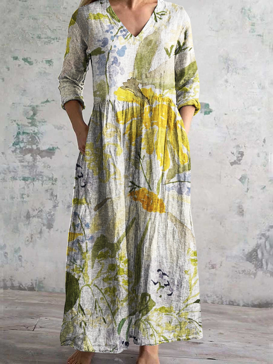 Abiti in cotone floreali artistici irregolari eleganti con scollo a V per donna