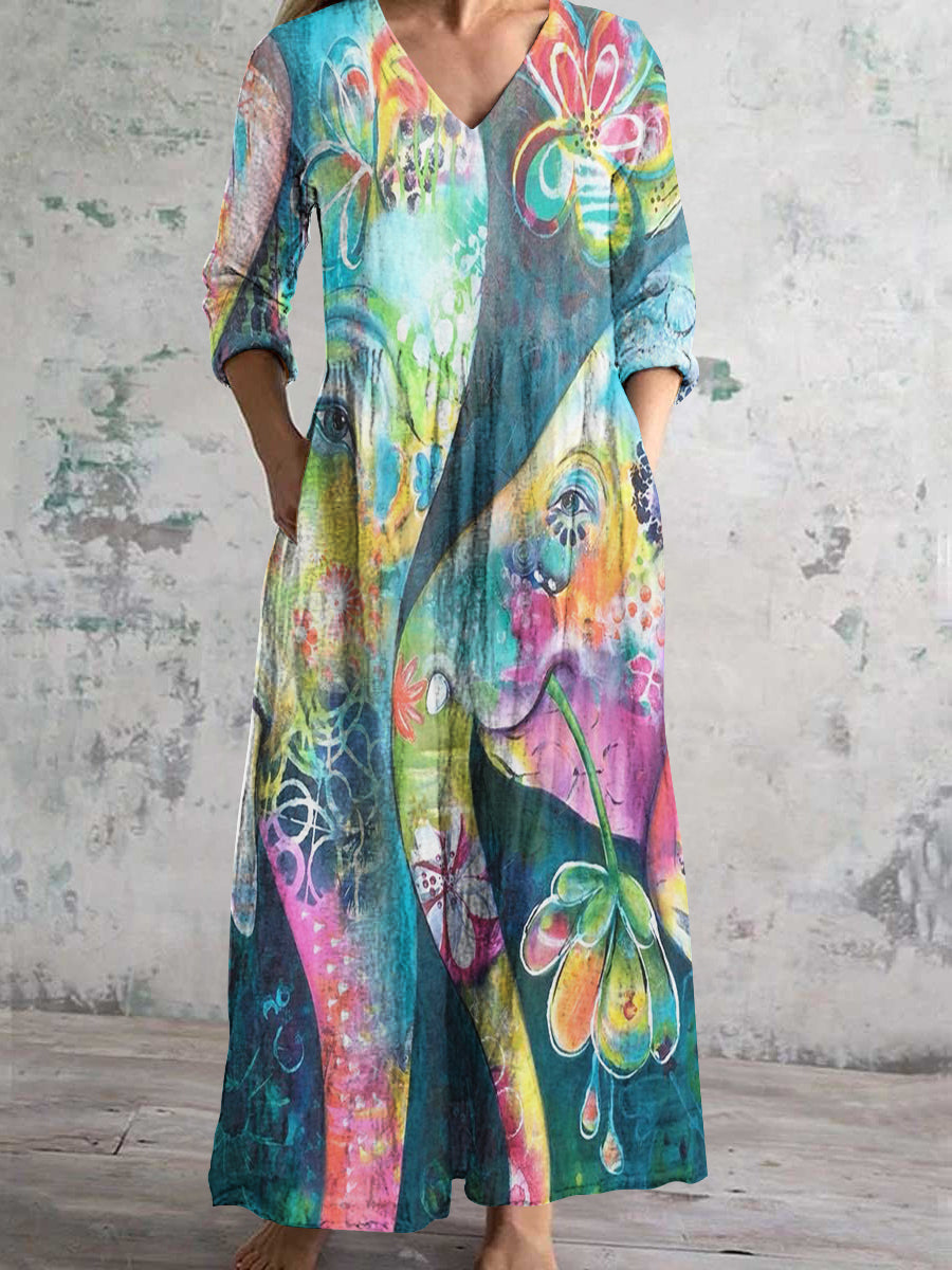 Abito in cotone e lino con tasche, arte astratta di elefante a scollo a V per donna